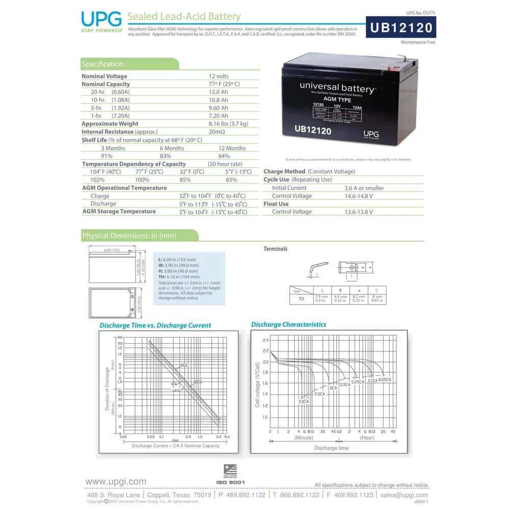 The SLA UB12120 12-Volt F2 Terminal AGM Battery is a premium quality absorbed glass mat technology (AGM) is ideal for ATVs, motorcycles, personal watercraft and snowmobiles. The Adventure Power AGM Battery was designed for more than performance; it was designed for the enthusiast with more cranking power than our competitors’ same sized battery. Frequent replacement and high maintenance are over. A 1-year warranty is also included for your peace of mind. The Adventure Power AGM Battery provides the most power and best value in the industry. Primary Applications: ATV, Emergency Lighting, Medical Mobility, Scooter, Security, UPS and Surge Protector.