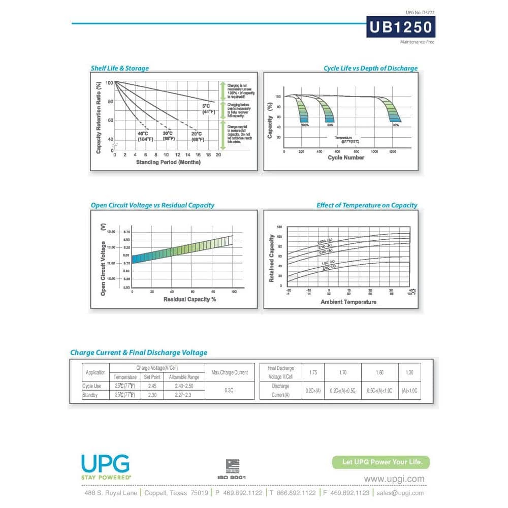 The SLA UB1250 12-Volt F2 Terminal Battery has premium quality absorbed glass mat technology (AGM) ideal for ATVs, motorcycles, personal watercraft and snowmobiles. The Adventure Power AGM Battery was designed for more than performance; it was designed for the enthusiast with more cranking power than our competitors’ same sized battery. Adventure Power batteries are completely spill proof and leak proof. Frequent replacement and high maintenance are over. A 1-year warranty is also included for your peace of mind. The key to this technology is the porous microfiber separators, which completely absorb and trap electrolyte. Molded top and side connection terminals provide versatility, increased strength and durability. The Adventure Power AGM Battery provides the most power and best value in the industry. Primary Applications: ATV, Emergency Lighting, Hunting, Medical Equipment, Security, UPS/Surge Protector.