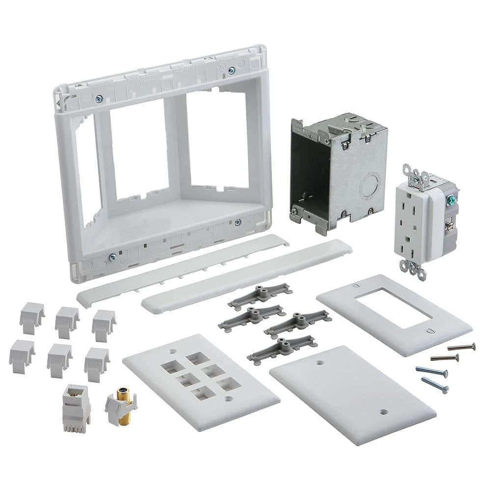 - Includes surge protective receptacle, cat5e Jack, F-connector, blank keystone inserts, wall plates and metal electrical box