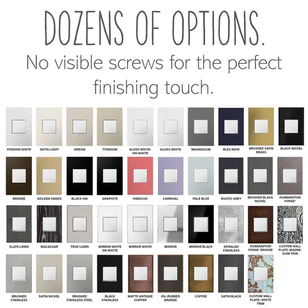 The adorne collection by Legrand offers solutions to match any taste and finishes to fit any personality. Whether you favor the clean lines of modern design, or cozy, cottage-style comfort, or even the classic elegance of a more traditional style, adorne is built to fit. Take your pick of white, magnesium, or graphite switches, dimmers, and outlets, and match them with a wide array of wall plate options. You will find everything from lush natural woods, metals, and fabrics to a brilliant spectrum of colorful solids. Watch these usually forgotten finishing touches transform your walls from blah to breathtaking, letting the personality of your design shine through.