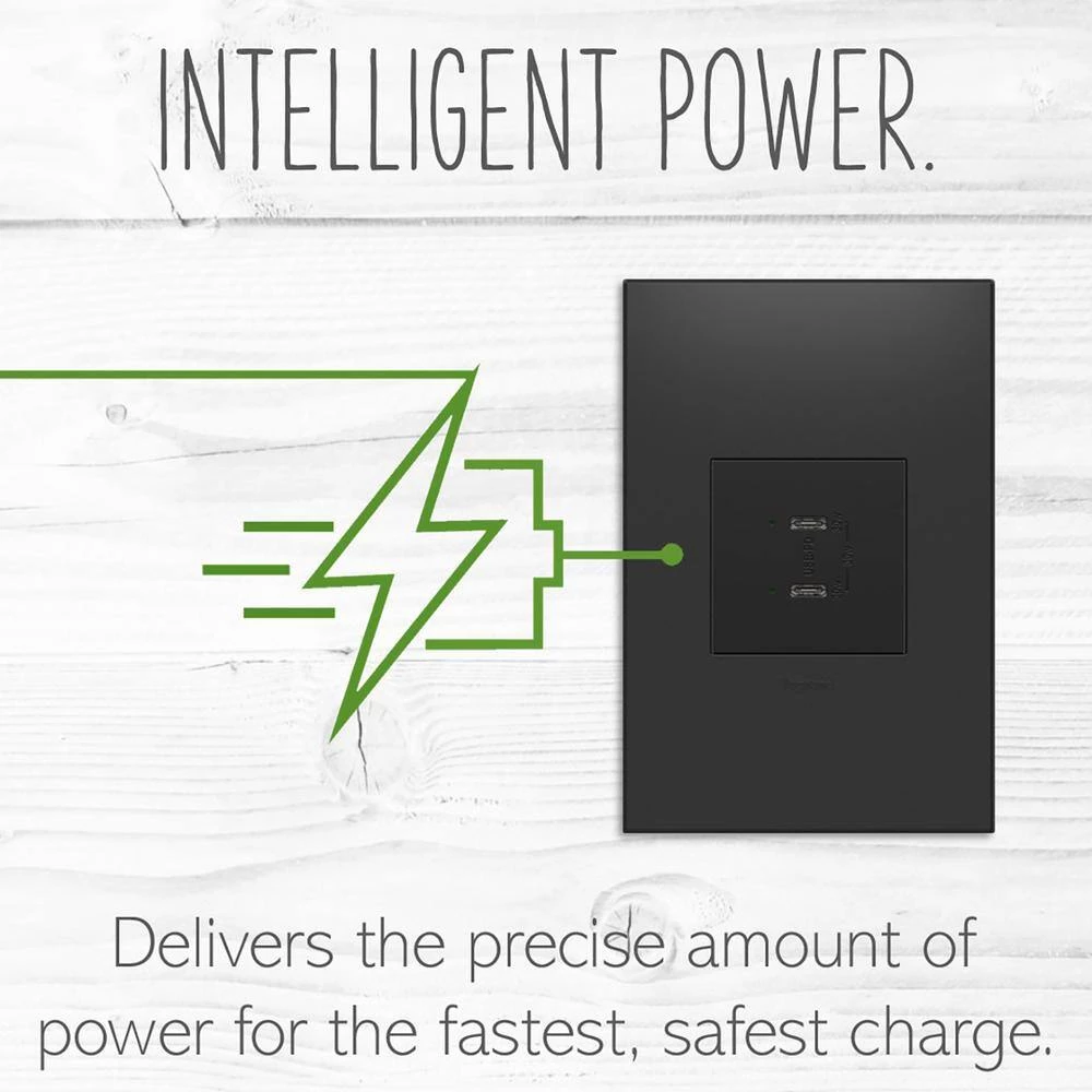 Charge devices up to 2X faster with the ultra-fast PLUS Power Delivery USB Outlet. Made to deliver a leading 30-Watt of power and featuring 2 built-in Type-C USB connections, this solution adds the intelligent charging of advanced Power Delivery to the industry-leading amperage of our ultra-fast line. The result is a faster, future-proof option for convenient in-wall charging, specially designed to optimize performance for your Power Delivery-enabled devices. Also includes multi-layered overcurrent protection to keep the outlet and your devices safe from damage. Easily replace a traditional outlet in as little as 10-minutes to gain modern functionality and the unique, contemporary aesthetic of adorne.