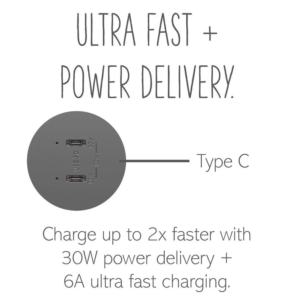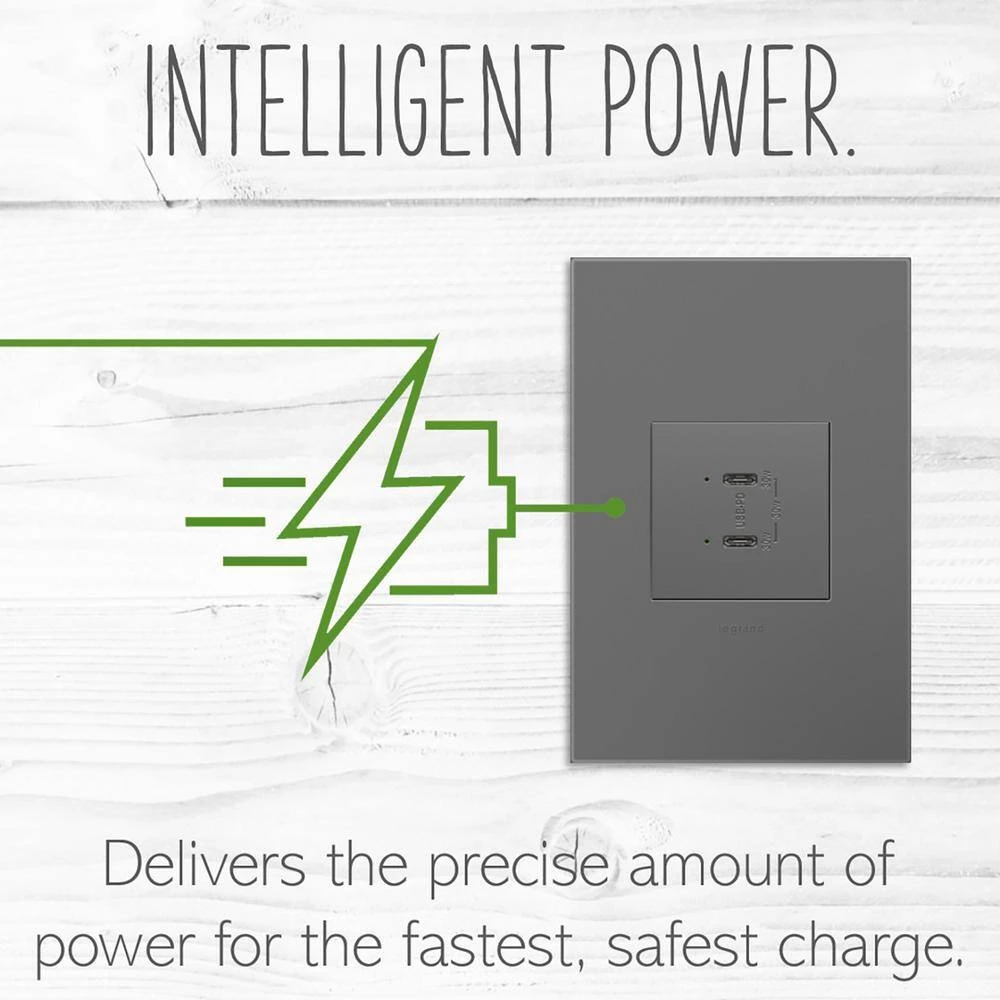 Charge devices up to 2X faster with the ultra-fast PLUS Power Delivery USB Outlet. Made to deliver a leading 30-Watt of power and featuring 2 built-in Type-C USB connections, this solution adds the intelligent charging of advanced Power Delivery to the industry-leading amperage of our ultra-fast line. The result is a faster, future-proof option for convenient in-wall charging, specially designed to optimize performance for your Power Delivery-enabled devices. Also includes multi-layered overcurrent protection to keep the outlet and your devices safe from damage. Easily replace a traditional outlet in as little as 10-minutes to gain modern functionality and the unique, contemporary aesthetic of adorne.