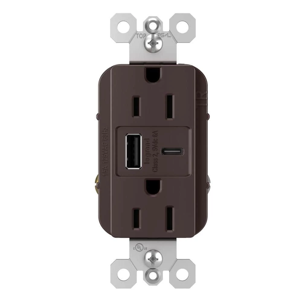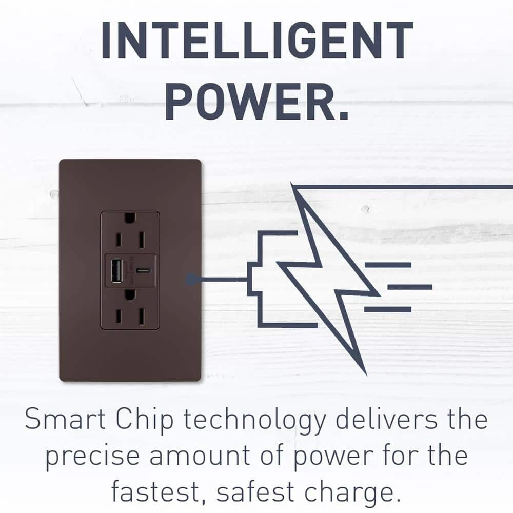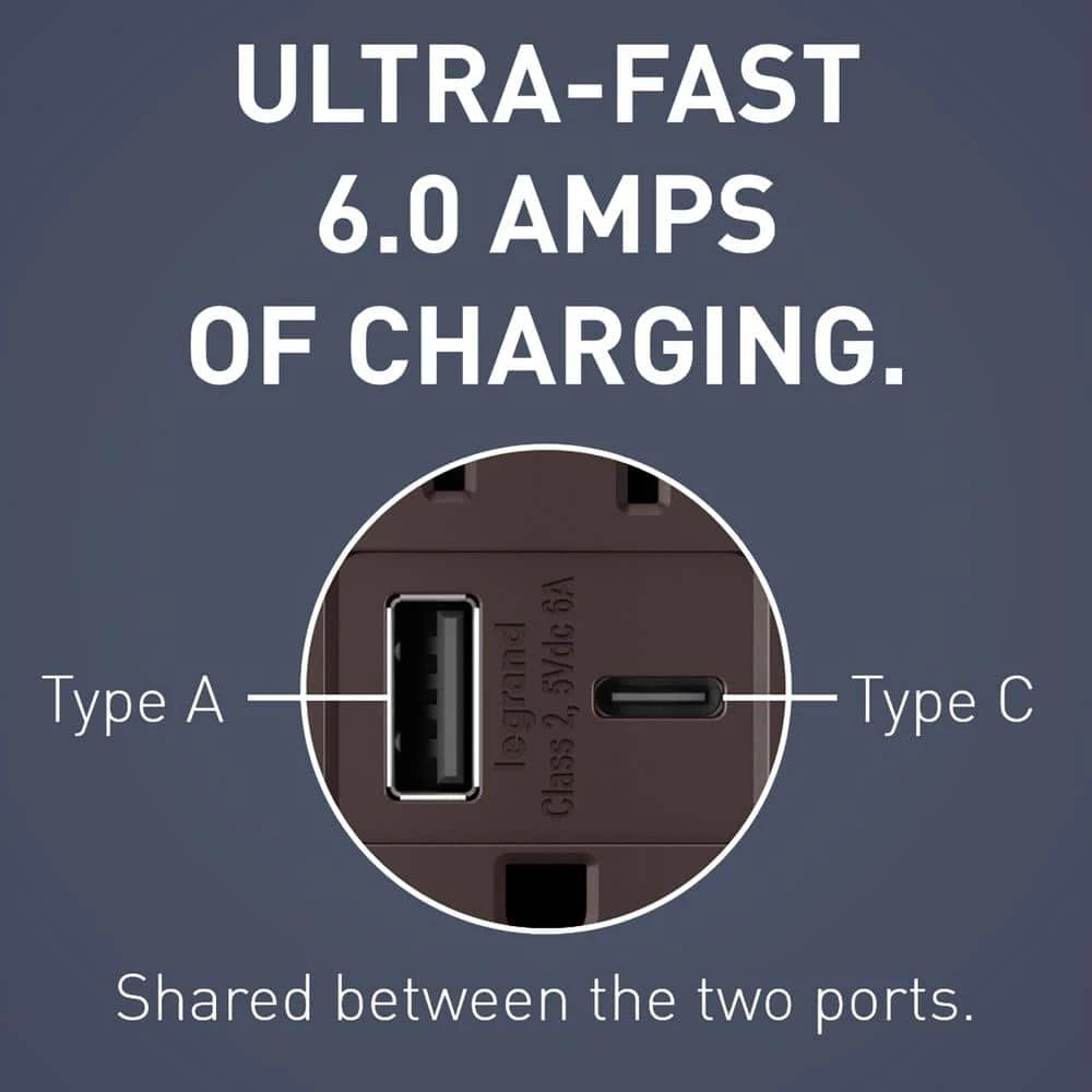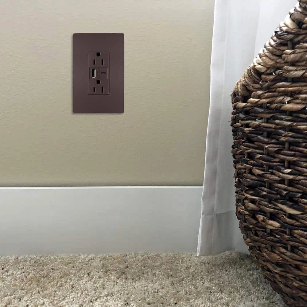 Charge your smartphones, tablets, and laptops up to 40% faster than 3 Amp to 5 Amp USB chargers, while enjoying the added power convenience of Tamper-Resistant outlets that meet NEC requirements with advanced charging capacity of 6.0 Amp shared between both ports. Designed to complement your decor, radiant layers on the style with tasteful finish options to coordinate with any decor. The metallic dark bronze finish is designed to complement the beauty of dark bronze lighting fixtures, faucets, and hardware.