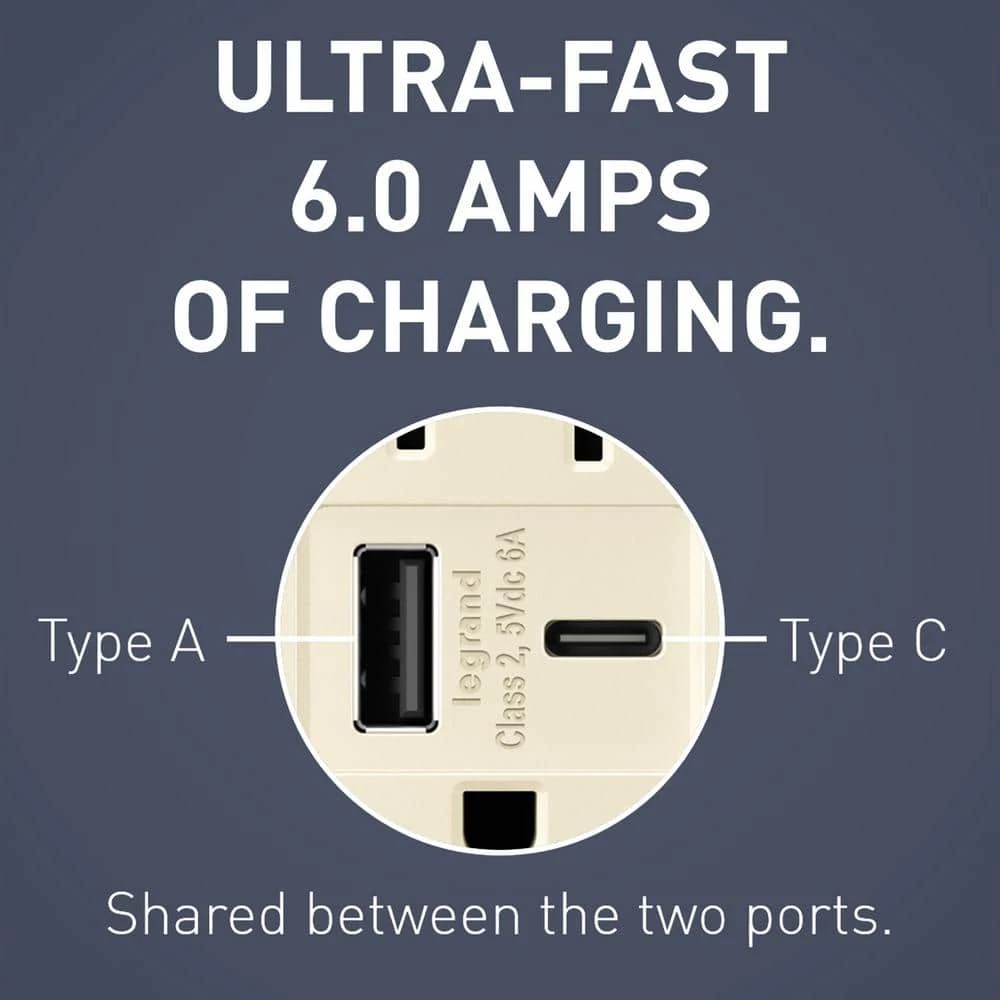 Install the fastest USB charger on the market. Charge your smartphones, tablets, and laptops up to 40% faster than 3 Amp to 5 Amp USB chargers, while enjoying the added power convenience of Tamper-Resistant outlets that meet NEC requirements. Industry-leading charging capacity of 6.0 Amp shared between both ports. Protects children: patented shutter system helps prevent improper insertion of foreign objects – now with black invisi-shutters for an invisible effect. Designed to complement your decor, radiant layers on the style with tasteful finish options to coordinate with any style.