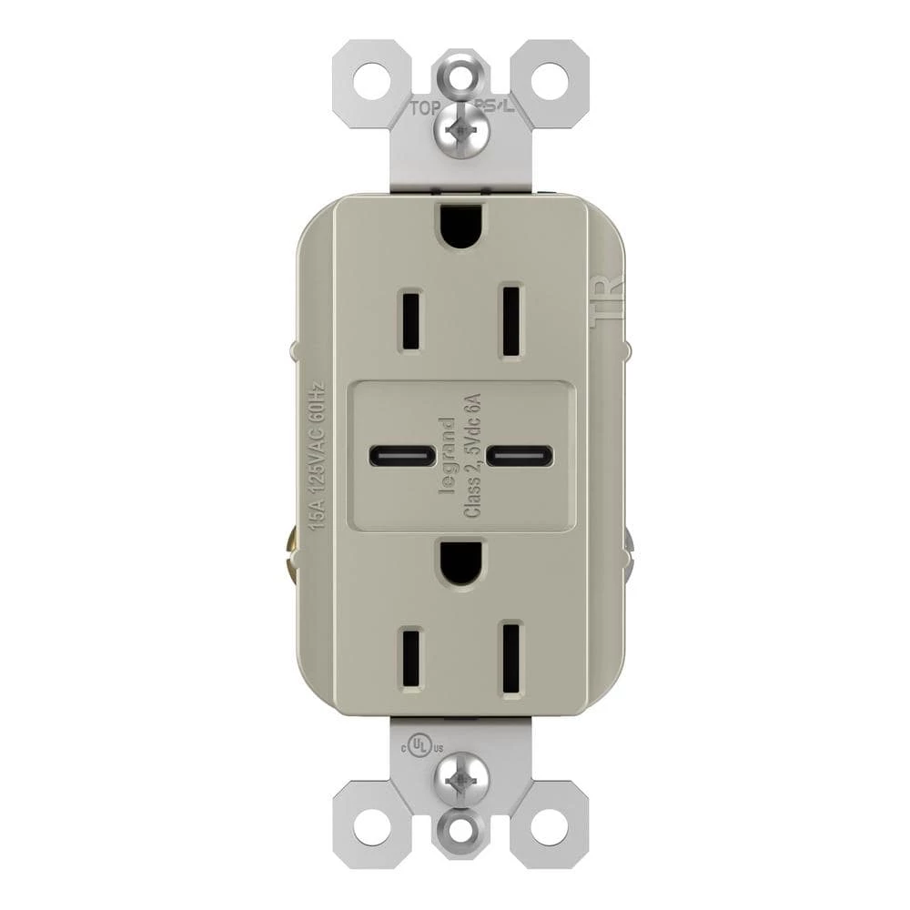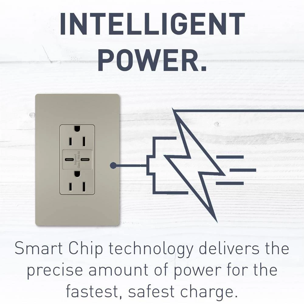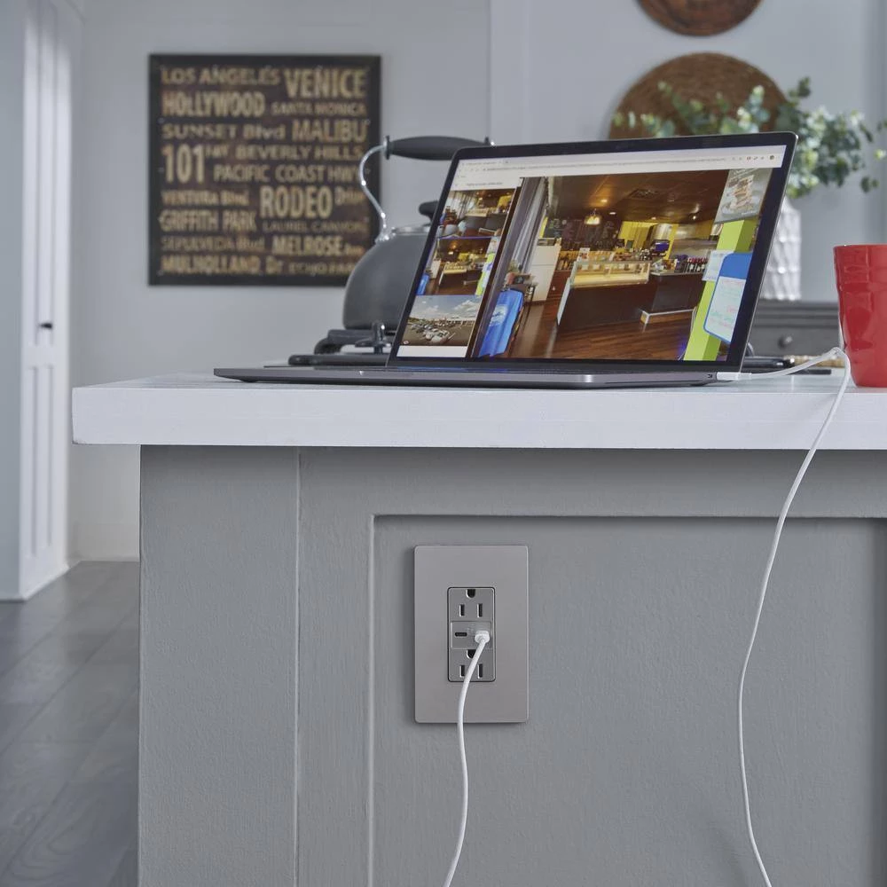 Charge your smartphones, tablets, and laptops up to 40% faster than 3 Amp to 5 Amp USB chargers, while enjoying the added power convenience of Tamper-Resistant outlets that meet NEC requirements with advanced charging capacity of 6.0 Amp shared between both ports. Designed to complement your decor, radiant layers on the style with tasteful finish options to coordinate with any decor. The metallic nickel finish is designed to complement the beauty of stainless-steel appliances, as well as nickel lighting fixtures, faucets, and hardware.