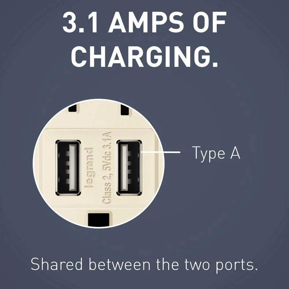 - Total charging capacity of 3.1 Amp, shared between both type A ports