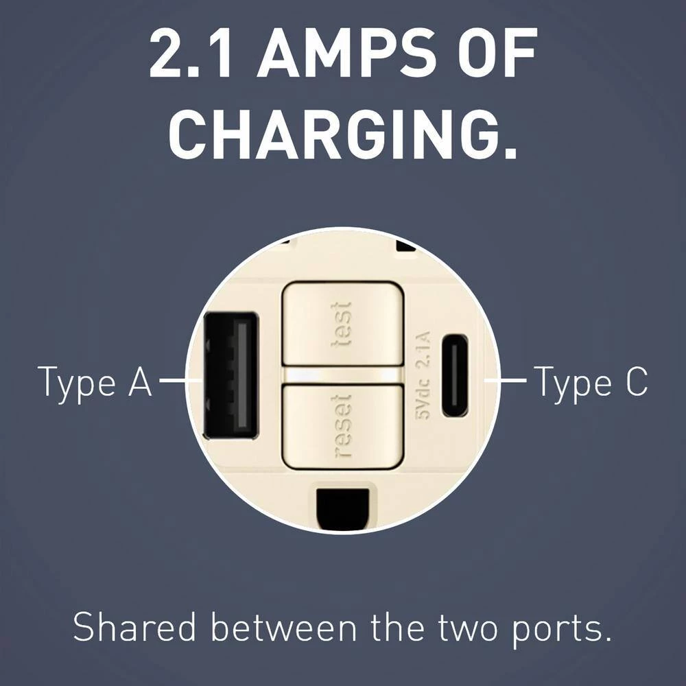 - Total charging capacity of 2.1 Amp, shared between stainless steel type a and type C USB ports rated at 10,000 insertion cycles