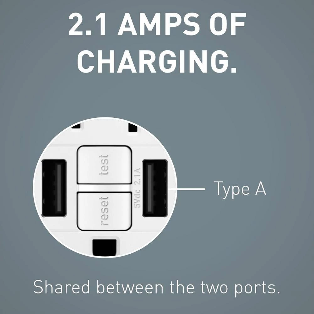 - Charge 2 mobile phones or tablets simultaneously with 2 USB type A charging ports with tamper-resistant outlets