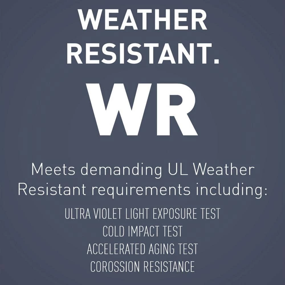- Listed to the weather-resistant supplement of UL498, meeting demanding UL requirements including: ultra-violet light exposure test, cold impact test, accelerated aging test, stringent material requirements for current-carrying parts, wire binding screws and mounting straps to ensure superior corrosion resistance