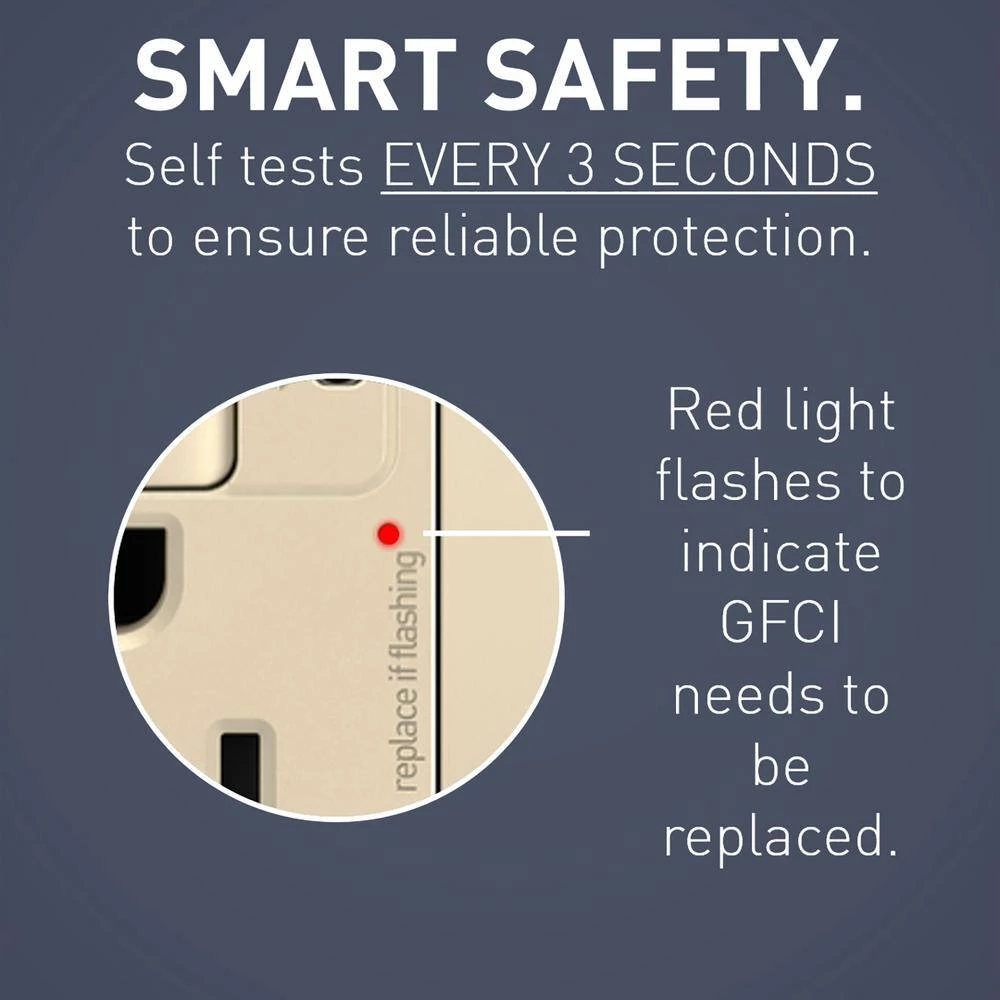 - Conducts an automatic test every 3-seconds, ensuring it’s always ready to protect – if the device fails the test, the trip indicator light (red LED) flashes to signal that the GFCI should be replaced