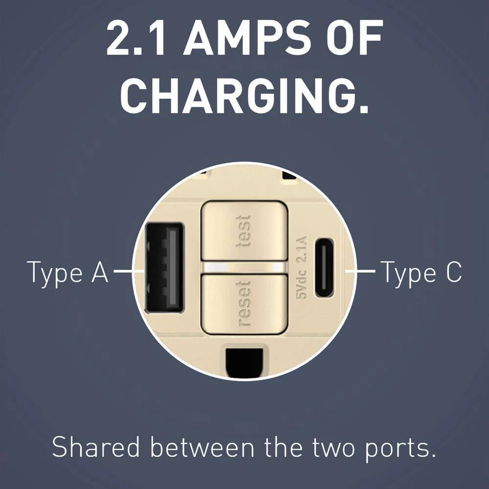 - Charge 2 mobile phones or tablets simultaneously with one USB type A and one USB type C charging ports with tamper-resistant outlets