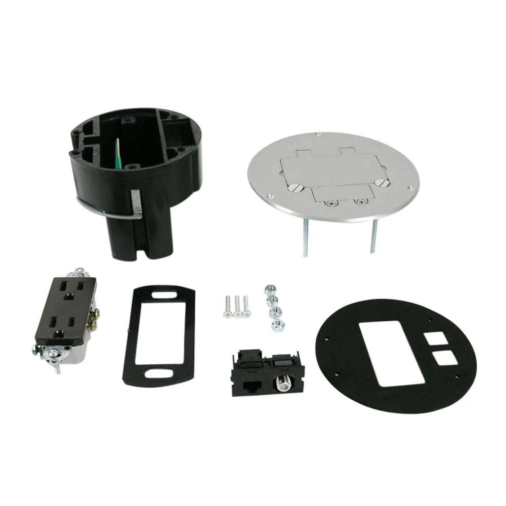 863 Series Residential Wood Floor Boxes provide an excellent and cost-effective solution for power and communication requirements in open spaces. 863 Series Floor Boxes provide dual service capability in an unobtrusive, compact, round floor box package. Includes round PVC floor box, 15 Amp, 125 Volt tamper-resistant decorator style receptacle, one coax F connector, one RJ45 Category 5e connector, and aluminum duplex opening cover plate with single flip lid.