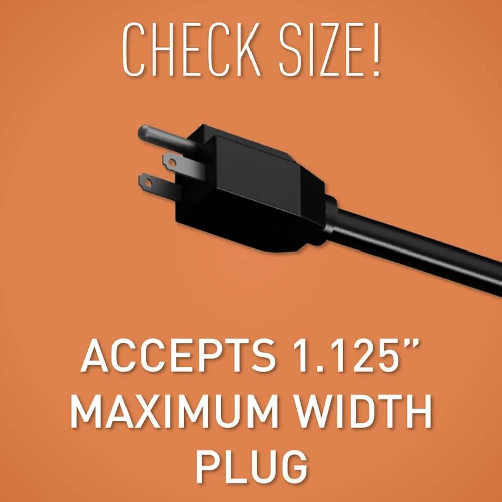- Works with most TV plugs with a maximum plug width of 1-1/8 in.